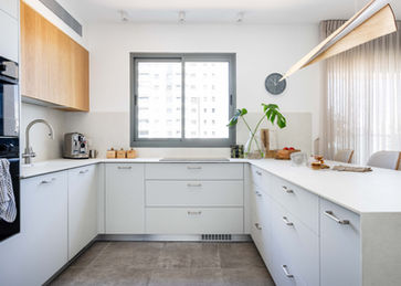 המטבח, שתוכנן עד הפרט האחרון, משלב נגרות בהירה עם אלמנטים מודרניים ופתרונות פונקציונליים, והופך למוקד המשפחתי סביב האי המרכזי. הנגרות המותאמת אישית חוזרת גם בחדר העבודה – שם שולחן עבודה משולב בארון חכם מייצר סביבת עבודה יעילה ואסתטית.